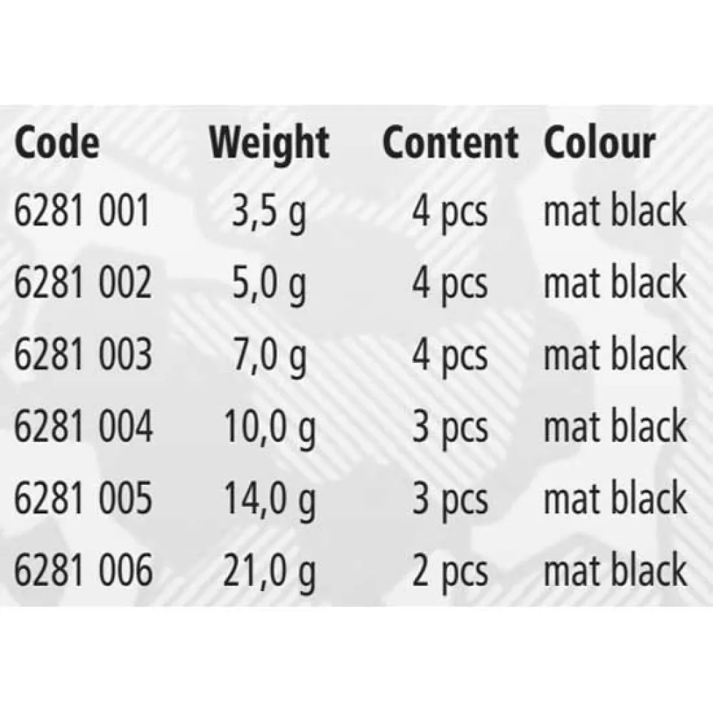 | Weight | 10 g Mat Black, 14 g Mat Black, 21 g Mat Black, 3.5 g Mat Black, 5 g Mat Black, 7 g Mat Black |