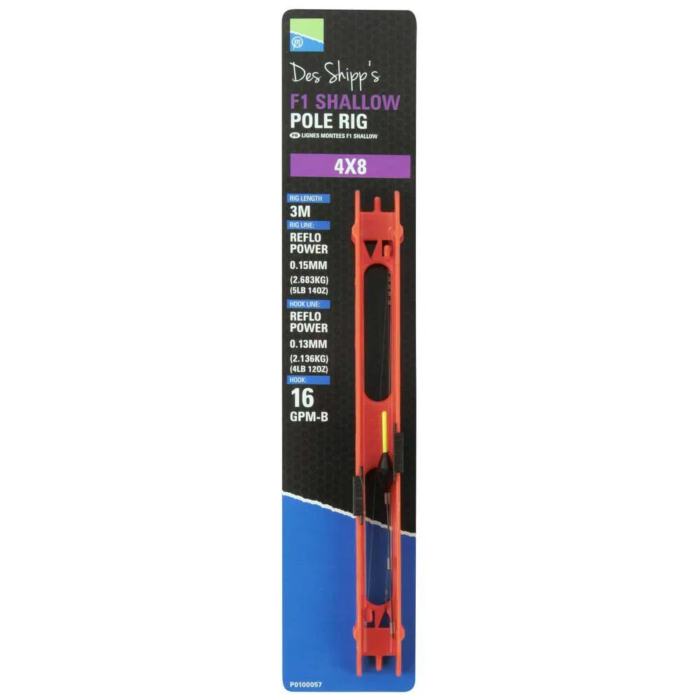 Constructed from the very finest components and based on rigs tied by our own consultants, the Des Shipp Commercial carp pole float rigs are perfect for use on all commercial fisheries. The floats feature the new Dura side eye which makes them far stronger than any float with a standard side eye, without altering the balance. Reflo Power is used for all main lines and hooklengths while our popular GPM-B hooks are the perfect all round hook that can be used for a wide variety of baits. Stotz are used on all of the rigs in a shotting pattern to suit the intended style of fishing. The F1 Shallow pole Float has a 1.5mm Hollow bristle and a carbon stem, perfect for fishing with smaller baits like maggots, pellets, casters and pieces of worm. The bulk shotting pattern is positive and helps to distinguish proper buites from F1´s.. A size 16 GPM-B hook finishes the rig which is ideal for maggots, casters, worm and pellets.