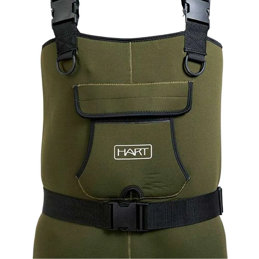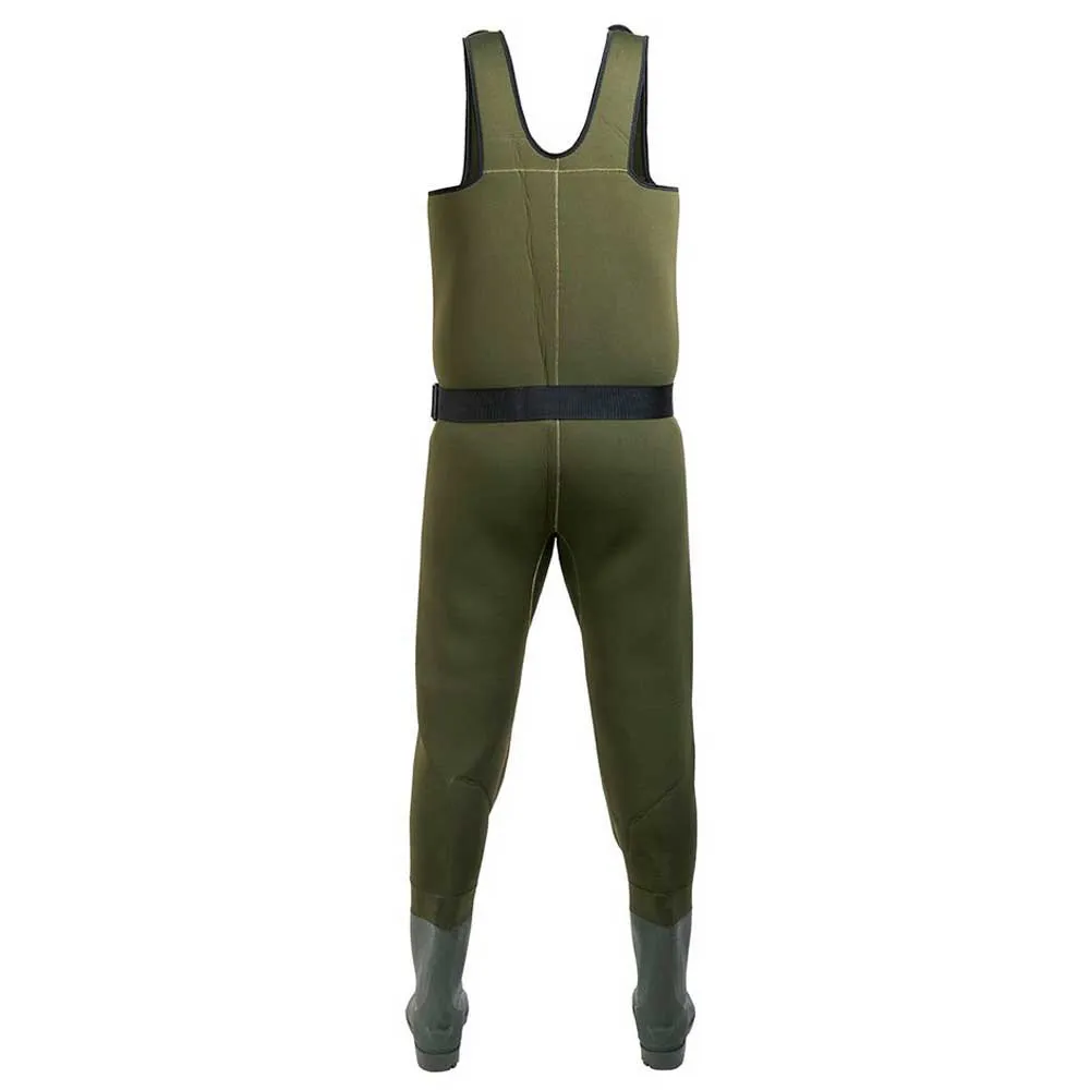 4.5mm thick neoprene wader. Integrated PVC boot. Adjustable neoprene straps. Preformed knee pads and outer chest pocket with velcro closure. Nylon rings to hang accessories to the chest. Inner nylon pocket. Nylon belt. Includes kit for emergency repairs. Nylon transport bag. Boot with rubber sole.