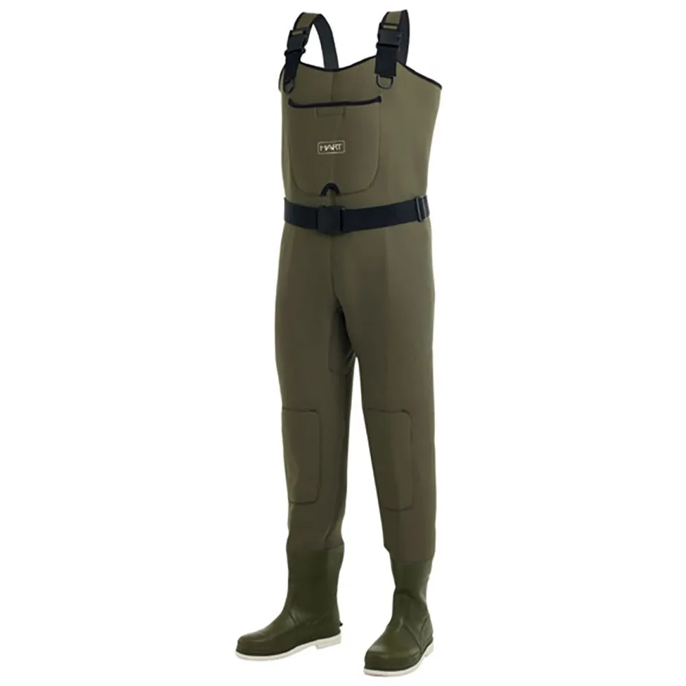 4,5 mm thick neoprene wader. Carefully designed in bicolour neoprene. Integrated rubber boot with a neoprene lining. Felt sole. Adjustable neoprene braces with hooks for greater comfort and safety. Pre-formed knee pads and outside chest pocket with velcro closure. Inside nylon pocket. Nylon belt with neoprene bum-bag ·Includes emergency repair kit. Nylon carry bag.