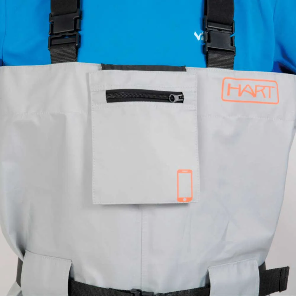 3-layer laminated waterproof / breathable fabric. Seams sealed. Removable inner chest pocket with zip. hydro-repellent. ATTENTION: This pocket is not waterproof nor does it admit be submerged in water without affecting the objects contained in its inside. Adjustable elastic straps for a more comfortable fit on shoulders. By combining the male / female chest hooks allows the wader to be folded up to the waist and held by turning said belt straps. Legs in warm super flexible neoprene with knee pads. Elastic neoprene leggings and clip boot hitch. High density neoprene socks with rubberized heel and tendon reinforcement to prevent wear and tear boot. Includes adjustable nylon belt with reinforced belt loops. Transport bag.