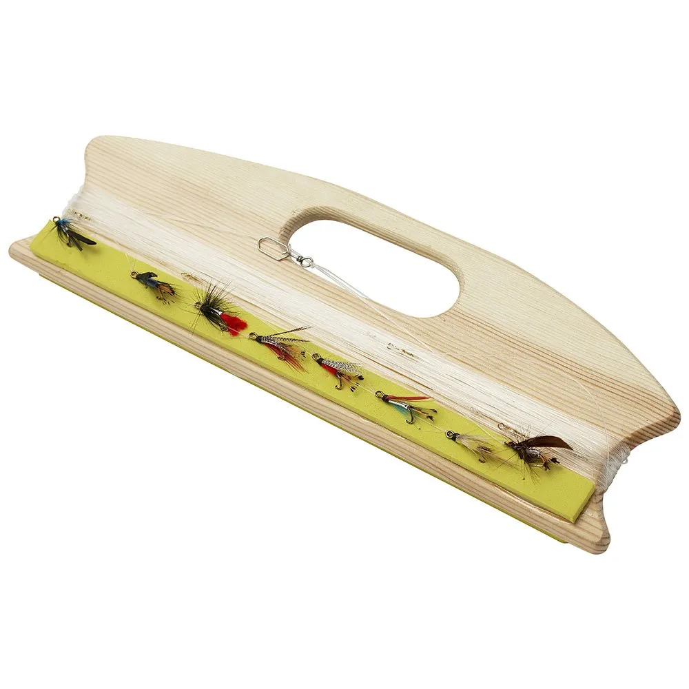 A wooden handle in the traditional style with a clear nylon line. On the line are 8 great patterns for trout ,char and greyling mounted. You can easily replace a fly if one should be lost.