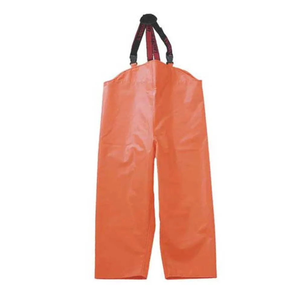 The pants have a high bib at the front and back with elastic adjustable belt straps with buckle closure.