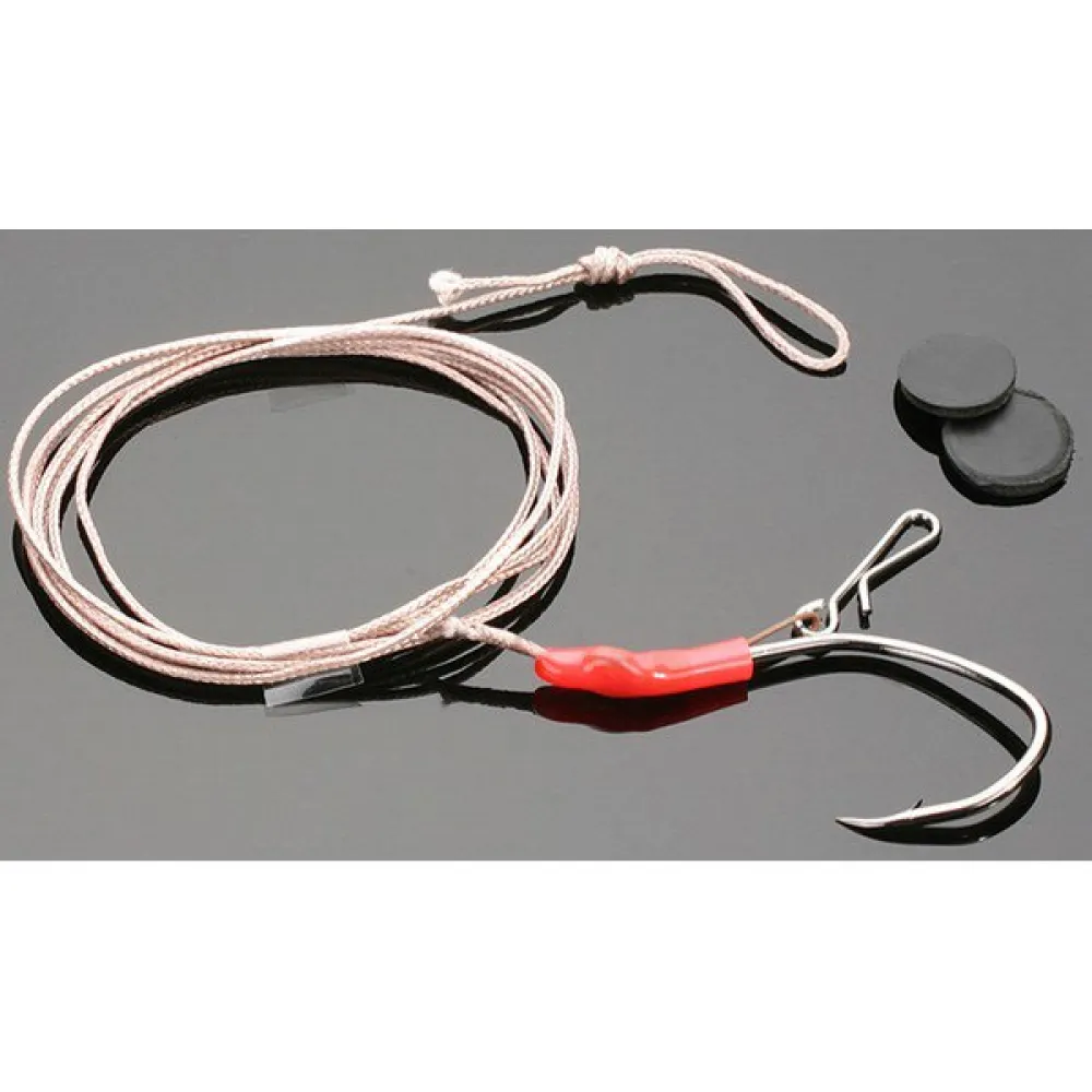In this leader, we used a special clip placed on a hair to attach the lure. It is suitable for both live bait and quick exchange of pellet.