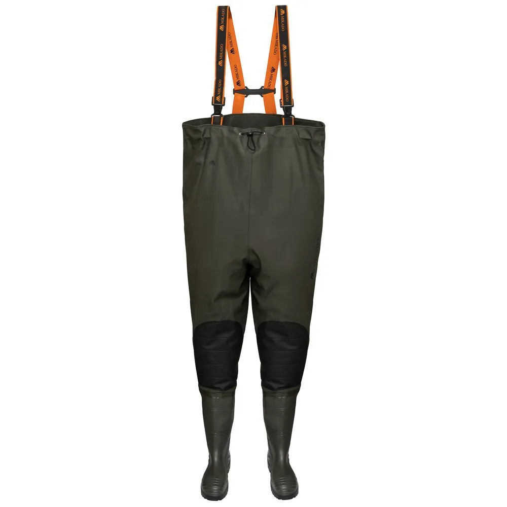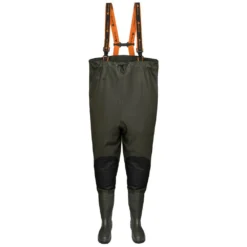 Chest waders made of a high-quality, reinforced polyester fabric. Additionally fitted with a document pouch and reinforcements on the knees. The boots were fitted with a treaded sole what provides a proper stability even at a slippery surface.