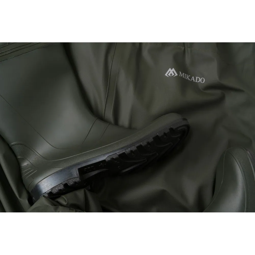 Chest Waders Made Of A High-Quality, Reinforced Polyester Fabric. Additionally Fitted With A Document Pouch And Reinforcements On The Knees. The Boots Were Fitted With A Treaded Sole What Provides A Proper Stability Even At A Slippery Surface.