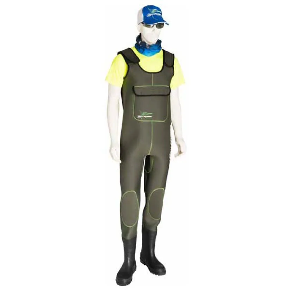 4mm Neoprene stocking. Rubber sole boot with a neoprene-lining for comfort and warmth. Double seam-sealed. Adjustable, built-in suspenders with quick release buckles allow for a comfortable fit. Front pocket. Quick-release belt for grater safety. Includes emergency repair Kit.