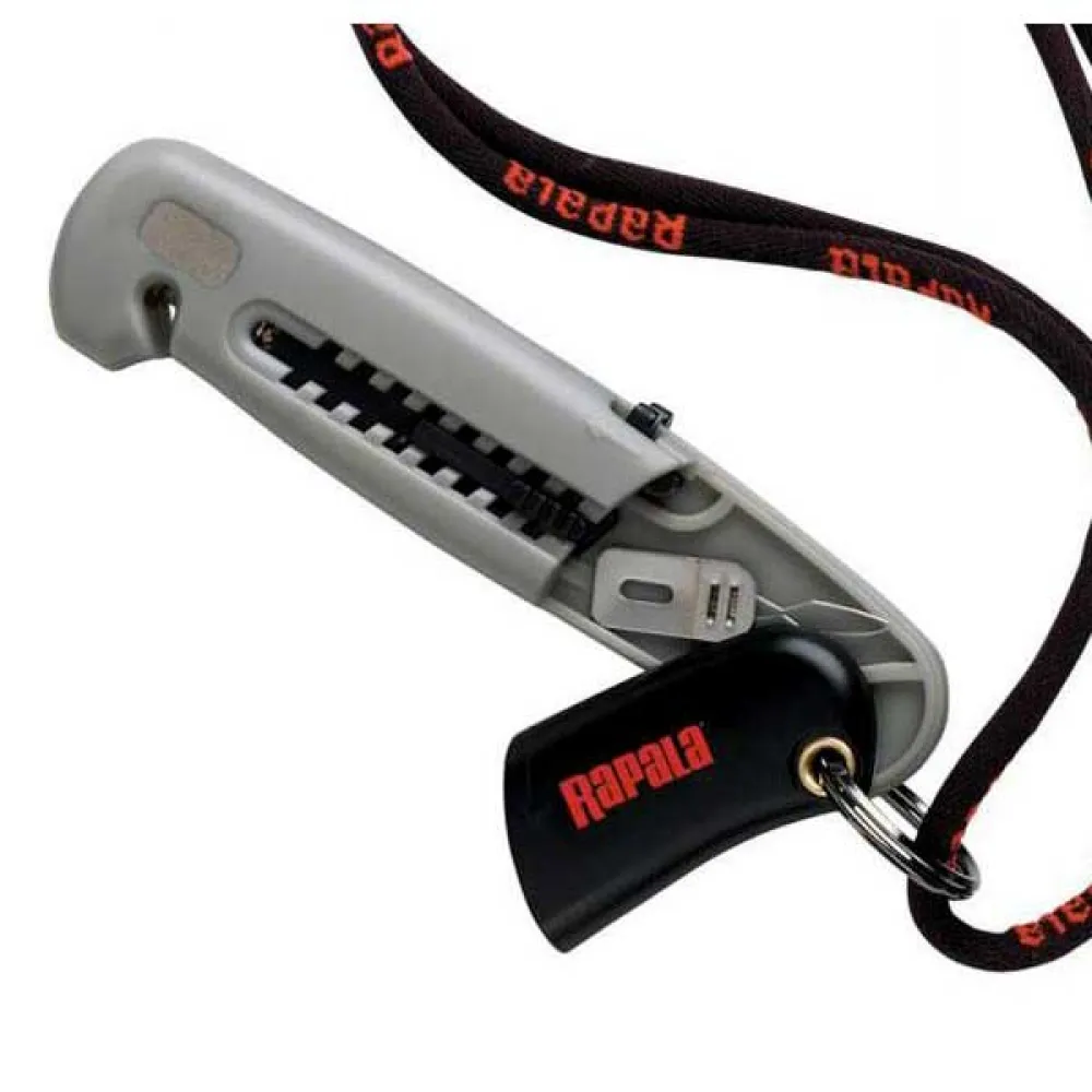 Five “must-have” angler tools. Line Cutter, Hook Sharpener, Retractable Line Threader and Disgorger/Jig Buster.