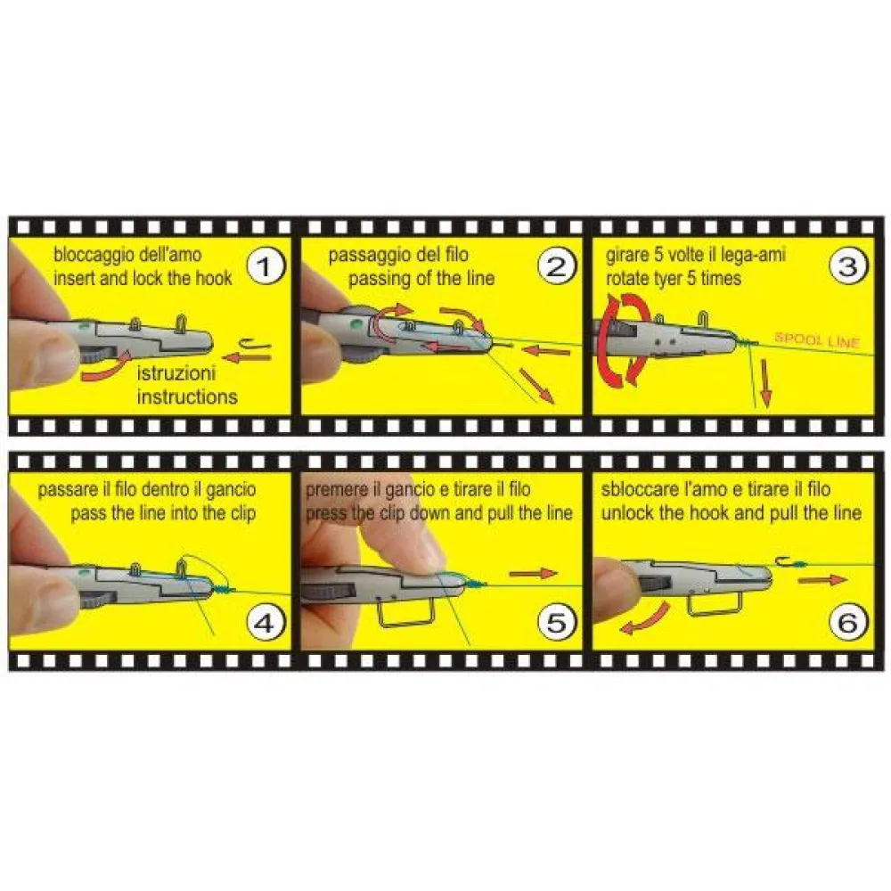 Device with soft touch handle for tying fishing hook to the line. Produced in two different sizes: the small one is specially designed for very small hook sizes from nr.14 to 28, the big one is suitable for hook sizes from nr.6 to 18. Supplied with full instructions